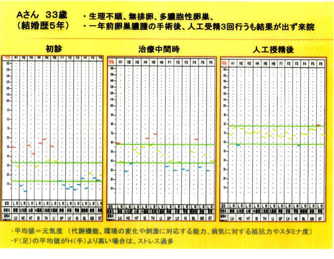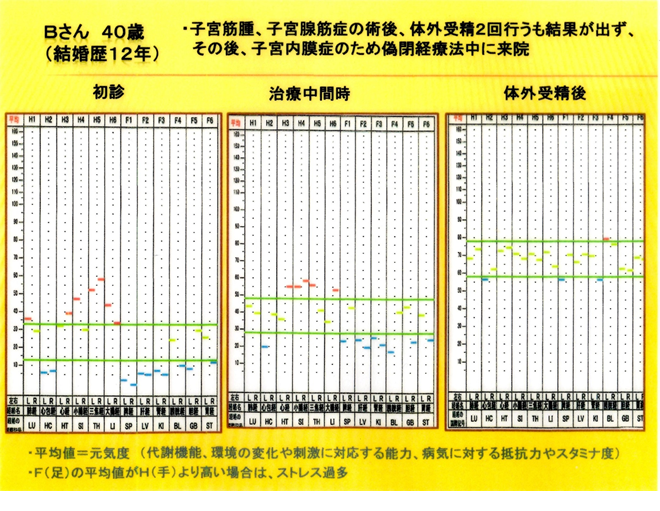 こちらも初診時~治療中間時~体外受精後と進むにつれて、緑色のラインが上がり、赤色と青色が少なくなっています。